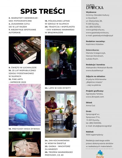 na łamach kwartalnika prezentują reportaże historyczne, felietony, gadki warmińskie a także opisy działań związanych z animacją społeczną, edukacją, ochroną dziedzictwa kulturowego czy życiem gminy. Forma i przekaz “Gazety Dywickiej” zależy od osób