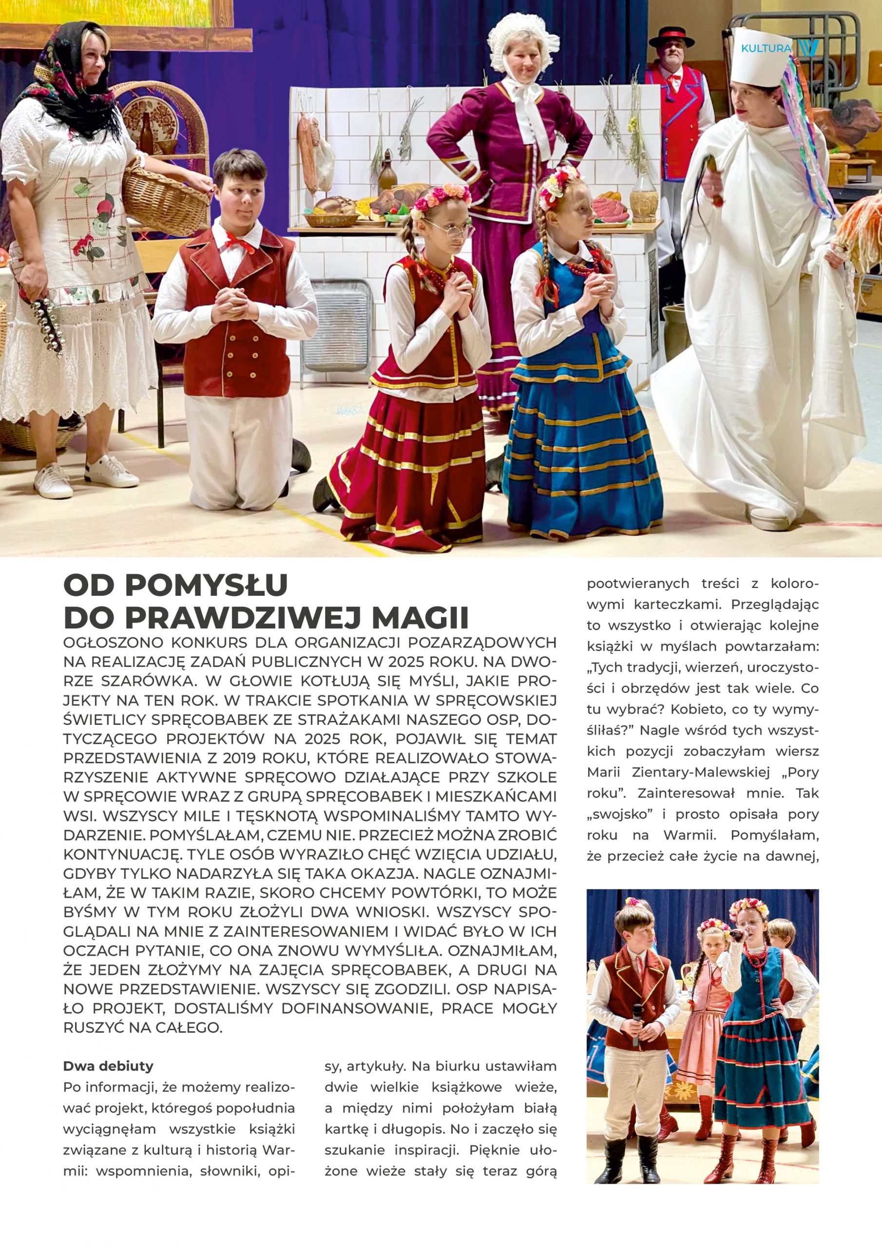 Ogłoszono konkurs dla organizacji pozarządowych na realizację zadań publicznych w 2025 roku. Na dworze szarówka. W głowie kotłują się myśli, jakie projekty na ten rok. W trakcie spotkania w spręcowskiej świetlicy Spręcobabek ze strażakami naszego OSP, dotyczącego projektów na 2025 rok, pojawił się temat przedstawienia z 2019 roku, które realizowało Stowarzyszenie Aktywne Spręcowo działające przy szkole w Spręcowie wraz z grupą Spręcobabek i mieszkańcami wsi. Wszyscy mile i tęsknotą wspominaliśmy tamto wydarzenie. Pomyślałam, czemu nie. Przecież można zrobić kontynuacjĘ. Tyle osób wyraziło chęć wzięcia udziału, gdyby tylko nadarzyła się taka okazja. Nagle oznajmiłam, że w takim razie, skoro chcemy powtórki, to może byśmy w tym roku złożyli dwa wnioski. Wszyscy spoglądali na mnie z zainteresowaniem i widać było w ich oczach pytanie, co ona znowu wymyśliła. Oznajmiłam, że jeden złożymy na zajęcia Spręcobabek, a drugi na nowe przedstawienie. Wszyscy się zgodzili. OSP napisało projekt, dostaliśmy dofinansowanie, prace mogły ruszyć na całego.